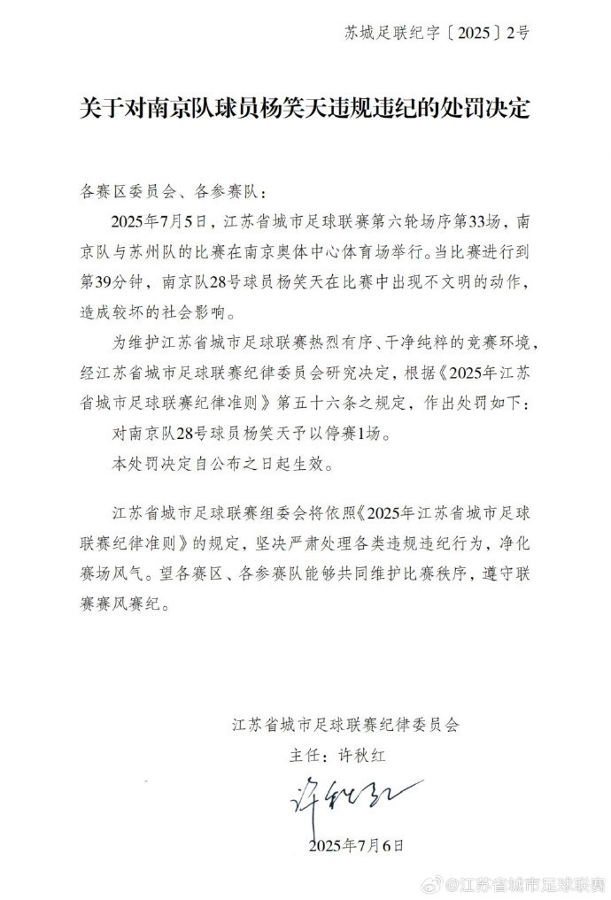 从五月到七月,我们欣喜地见证了“苏超”从萌芽再到如今成为现象级的事件。“苏超”以及相关媒体机构在努力地展示苏超的火爆、激烈、高水平的同时也在积极地维护着“苏超”的正面形象。而向杨笑天开出的罚单中也曾写道,他“造成较坏的社会影响”,这也或多或少地解释了为何这单罚单会被开出。