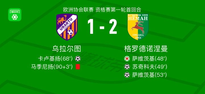 北京时间7月11日欧洲协会联赛 资格赛第一轮首回合,乌拉尔图对阵格罗德诺涅曼。乌拉尔图卡卢基扬破门。格罗德诺涅曼苏奇科夫破门,萨维茨基破门。最终比分乌拉尔图 1-2 格罗德诺涅曼。