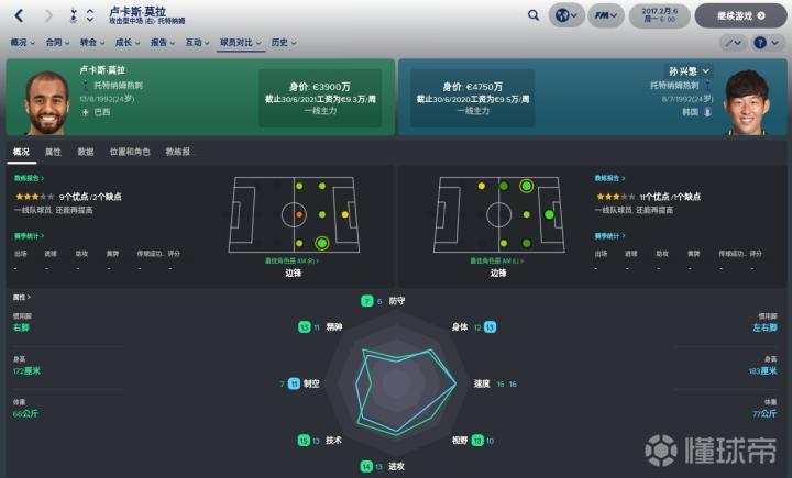 技术属性PK:两名球员的技术风格稍有不同,能够踢前锋的孙兴慜风格相对直接一点,而小卢卡斯明显在个人技术方面领先不少。在14项技术属性当中,卢卡斯9项数据占优,在传球、传中、技术、盘带等各方面占据优势,而孙兴慜则占优4项,最大的优势是头球(12:7)、远射技术(15:10)。可以看到孙兴慜对球门的威胁更大,而小卢卡斯的小技术更佳。