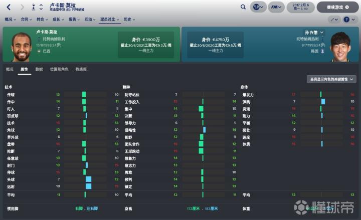 身体属性PK:身体素质方面孙兴慜要稍稍占优,8项数据占优4项,2项持平。两名球员都是速度流,小卢卡斯的爆发力更佳(17:16),速度方面两人持平,两个人都很灵动,但小卢卡斯在灵活方面稍稍领先(16:15),这或许是巴西球员的桑巴基因的优势。孙兴慜最大的优势是弹跳(10:7),毕竟其比小卢卡斯要高10cm。整体来看,两名球员身体素质都非常棒,孙兴慜总体领先,这也是为什么孙兴慜能够在英超联赛有高光表现的原因之一,相反我们的中国球员现在身高没有优势,技术、意识没有优势,力量、速度没有优势,所以很难在欧洲联赛发展。
