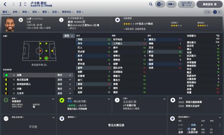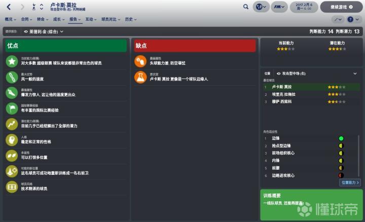 FM2018对卢卡斯的隐藏属性评价不太理想,不管好的还是坏的,小卢卡斯的隐藏属性就没有超过15的,其最高的数值是职业(14)、雄心(14)与情绪控制(14),这个数值只能说勉强够用,想要成为世界足坛顶级的攻击手还远远不够。除了这几个,卢卡斯的其他属性就有点惨不忍睹,适应性比较低(8),这可能会影响到小卢卡斯前期在热刺以及英超联赛的发挥,毕竟法甲与英超联赛的风格差距很大,英超这种高压力、高对抗的比赛节奏并不太好适应。而只有8的大赛发挥也有些让人揪心,毕竟托特纳姆热刺队是一支决心争冠的球队,除了英超联赛,欧冠联赛也是他们想要获得成功的地方,较低的大赛发挥不利于小卢卡斯在大赛中的表现。另外2018年是世界杯年,如果巴西主帅蒂特想带小卢卡斯去参加世界杯,大赛发挥这一点也应该被考虑。