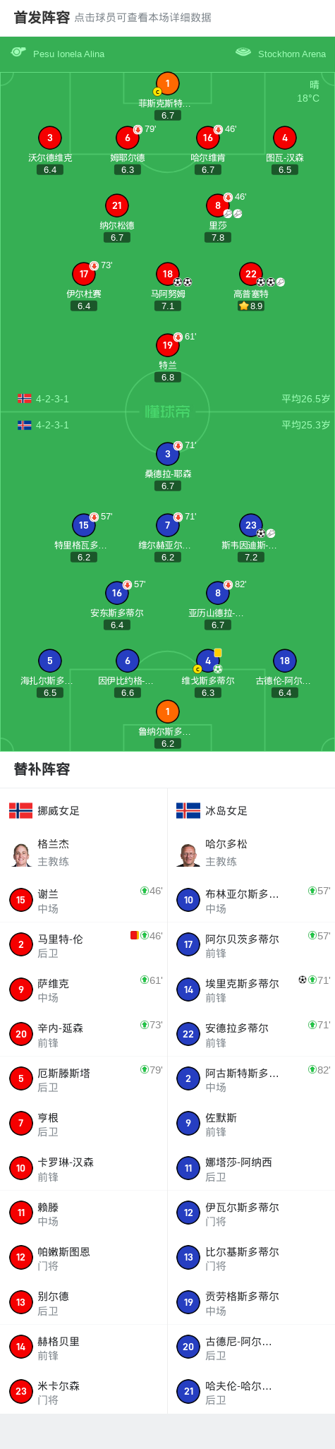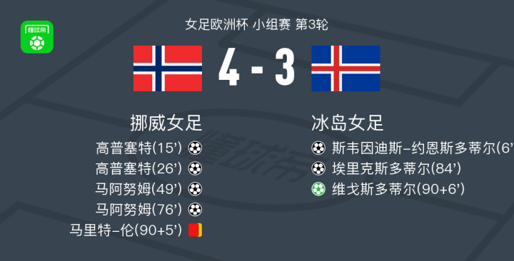 女足欧洲杯小组赛第三轮,挪威女足以4比3险胜冰岛女足。比赛中,挪威女足的高普塞特表现出色,先后两次攻破对手球门,马阿努姆同样贡献两粒进球。冰岛女足方面,斯韦因迪斯-约恩斯多蒂尔、埃里克斯多蒂尔以及维戈斯多蒂尔各入一球。比赛过程中,挪威女足球员马里特-伦在补时阶段吃到第二张黄牌被罚下场,冰岛女足则由维戈斯多蒂尔在最后时刻罚入点球,为球队追回一分。最终,挪威女足以四比三的比分战胜对手,全取三分。