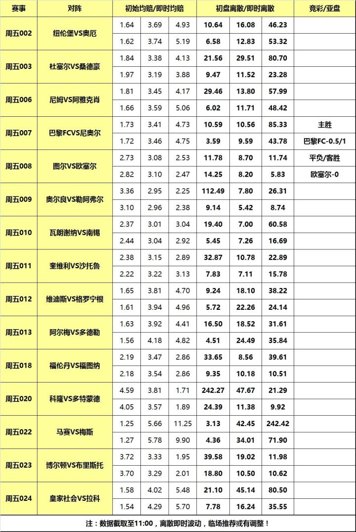 [关于离散] 是竞技彩票特有分析指数,指数基于百家欧赔即时赔率分歧度。基本原理是:百家欧赔平均值与每家赔率差值的绝对值的求和。离散度小则赔率公司观点接近,进而 彩果易打出,离散度大则反之意见分歧大,彩果不易打出。又因庄家操盘/变赔影响,离散低则概率高理论并非放之四海而皆准,需结合盘赔和基本面等信息综合运 用。简言之,离散是参考指标,而非填单依据!以下是各场数据汇总(数据截取至11:00):