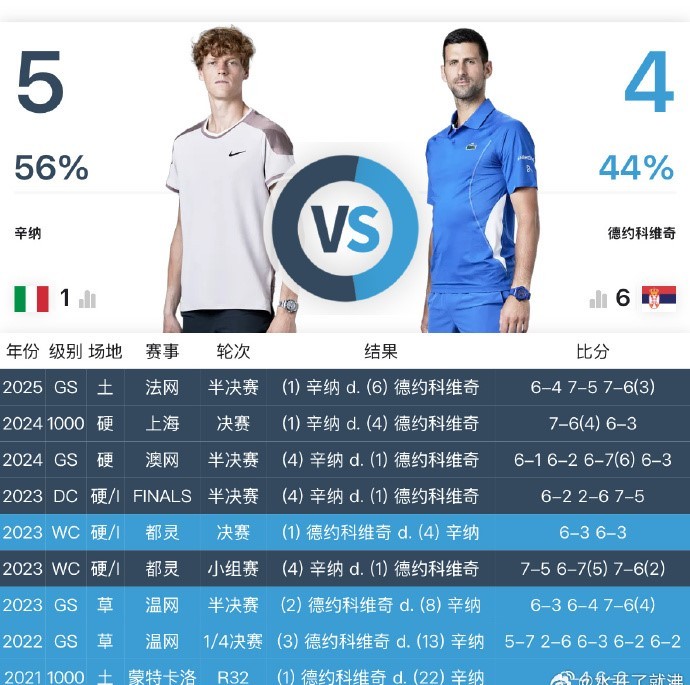 交手纪录上,德约4连败辛纳,目前4-5落后。这场焦点之战将于北京时间今晚22:30打响。