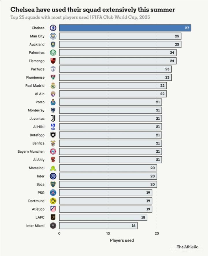根据The Athletic的统计数据,世俱杯截至目前,切尔西已经使用了27人,为该赛事最多,而曼城则以25人位居第二。