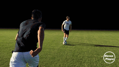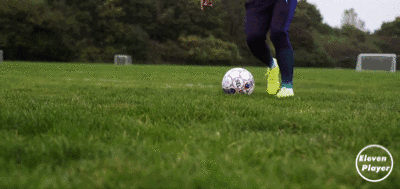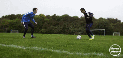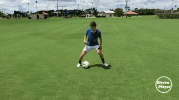 然后再一个连续的动作内用脚内侧把球向内侧前方拨去。