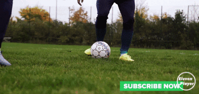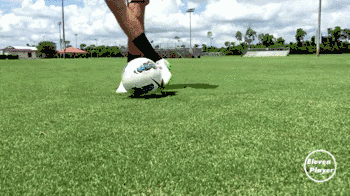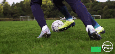 最后用右脚绕到左脚(支撑脚)之后做一个插花脚的动作用右脚脚背把球向前弹。