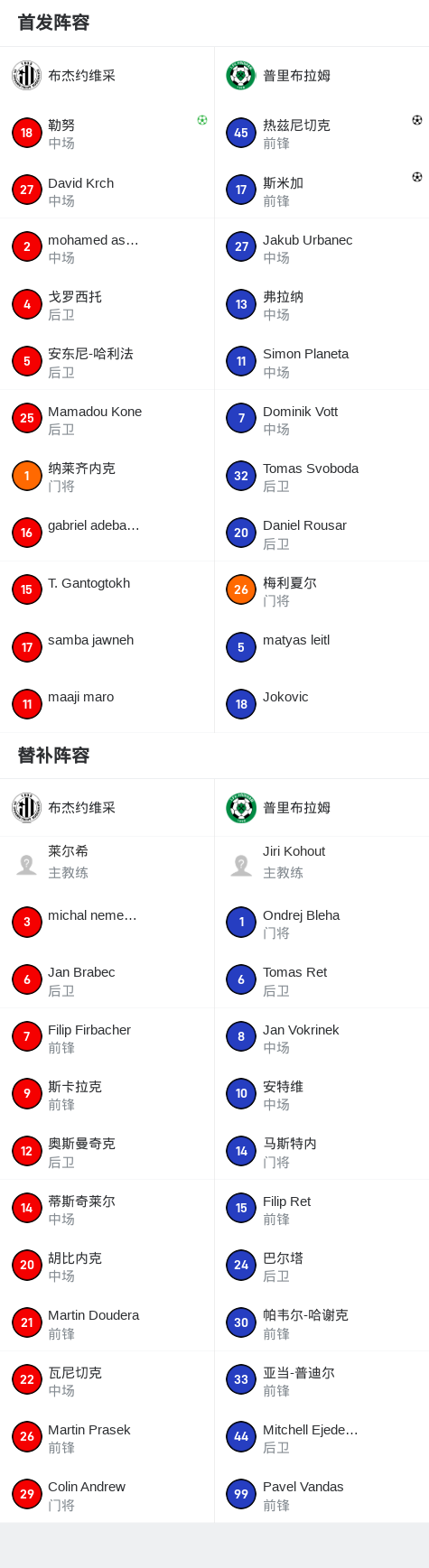 北京时间7月12日俱乐部友谊赛,布杰约维采对阵普里布拉姆。布杰约维采勒努破门。普里布拉姆热兹尼切克破门,斯米加破门。最终比分捷克布杰约维采 2-2 普里布拉姆。