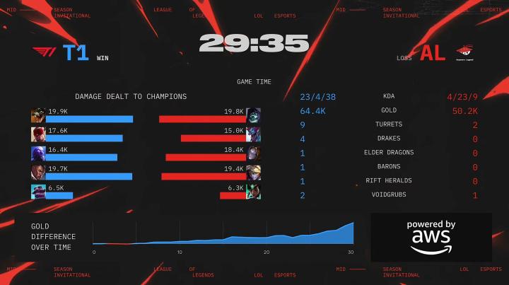 28分钟,T1进攻远古巨龙,团战中Oner李青拿下双杀,T1团灭AL并推平基地拿下胜利。