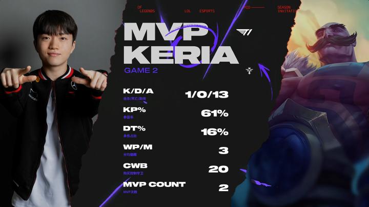 MSI败者组决赛正在进行,第二局游戏中,T1一扫第一局的颓势,从一开局就节奏爆炸,最终通过不停地滚动雪球赢得第二局胜利,局分扳为1-1。本局比赛MVP给到T1辅助Keria的布隆。