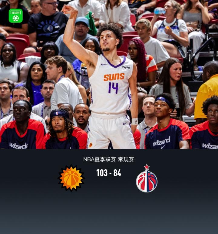 北京时间7月12日,NBA夏季联赛,菲尼克斯太阳对阵华盛顿奇才。半场太阳47-39奇才,最终太阳103-84奇才。