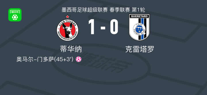 蒂华纳1-0克雷塔罗战报bot @懂球帝2025-07-12 13:08北京时间7月12日墨西哥足球超级联赛春季联赛第1轮,蒂华纳主场迎战克雷塔罗。比赛中,克雷塔罗球员奥马尔-门多萨在上半场补时阶段不慎自摆乌龙。凭借此进球,蒂华纳以1比0战胜对手,取得比赛胜利。点击查看本场比赛详细数据>>点击查看墨超完整积分榜>>精彩瞬间上半场补时第3分钟,克雷塔罗球员奥马尔-门多萨自摆乌龙。展开更多
