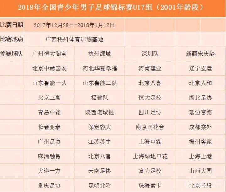 2018年全国青少年男子足球U17锦标赛于2017年12月28日在广西梧州国家体育训练基地开赛,2018年1月12日结束,历时16天,共分为8个小组, A-G组每组五支球队,H组为4支球队,共计39支球队参赛,其中山东鲁能派出两支球队参赛,陕西老城根、珠海索卡、广东梅县客家等球队也参加了该年龄段的比赛。
