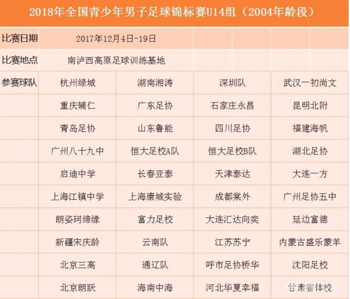 2018年全国青少年男子足球U14锦标赛于2017年12月4日在云南泸西高原足球训练基地开赛,山东鲁能、河北华夏幸福、深圳足协、长春亚泰、恒大足校以及江苏苏宁等28支球队参赛,值得一提的是来自甘肃和内蒙古的两支球队,甘肃省体校和内蒙古盛乐蒙羊也参加了本届锦标赛。