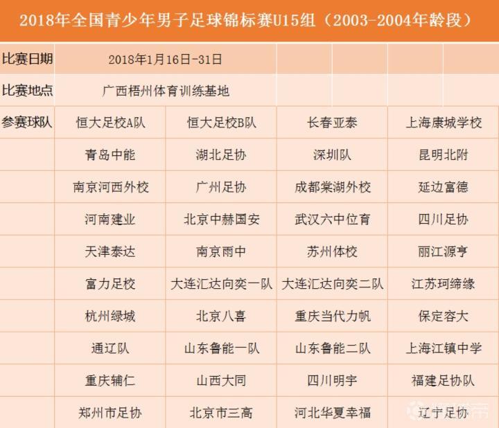 2018年全国青少年男子足球U15锦标赛于2018年1月15日进行了赛事分组,并在1月16日正式开赛。本届U15锦标赛在广西梧州国家训练基地进行,共分为6个小组,共计36支球队参赛。山东鲁能、上海上港、北京国安等球队悉数在列,其中,山东鲁能、大连汇达向奕等球队更是派出了两支球队参赛。