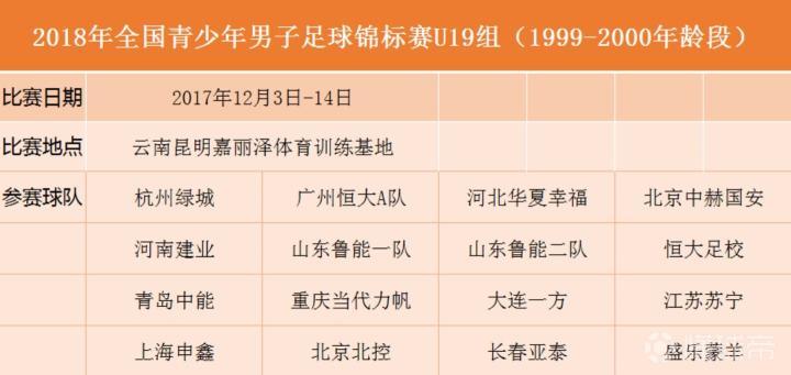 2018全国青少年男子足球U19锦标赛于2017年12月3日在云南昆明嘉丽泽体育训练基地打响,U19锦标赛共分为4个小组,共计16支球队参赛,其中包括2017年中超俱乐部精英梯队联赛冠、亚军大连一方和河北华夏幸福。山东鲁能除了派出在2017年U18联赛中夺冠的鲁能二队之外,此前主要在巴西接受训练的鲁能一队也参加了本届比赛。