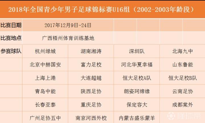 12月17日,U16锦标赛5轮小组赛全部战罢,山东鲁能、北京中赫国安、杭州绿城、长春亚泰、恒大足校A队、南京河西外校、成都棠外以及北海九中8支球队晋级淘汰赛。2017年该年龄段联赛亚军上海上港与季军朗资珂缔缘小组赛即遭淘汰,无缘八强。