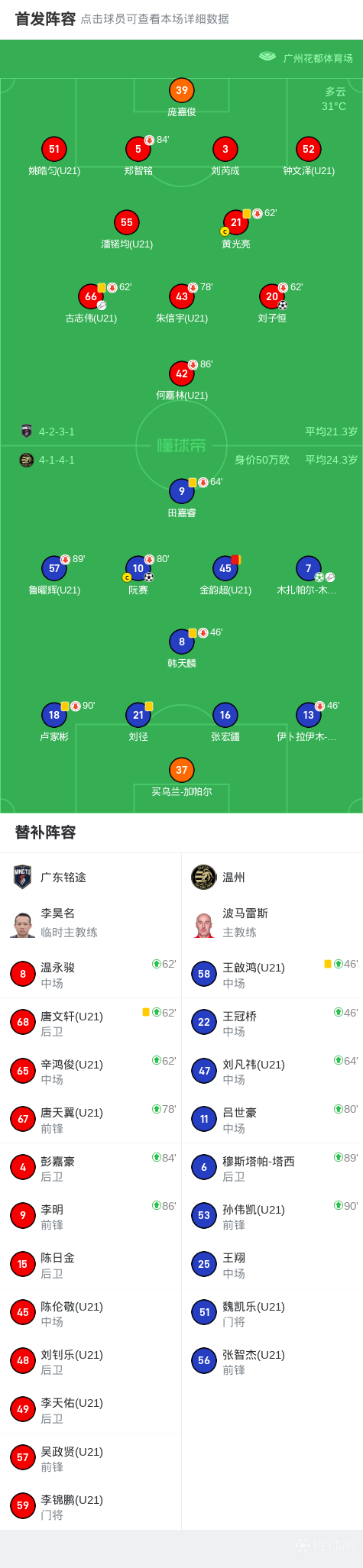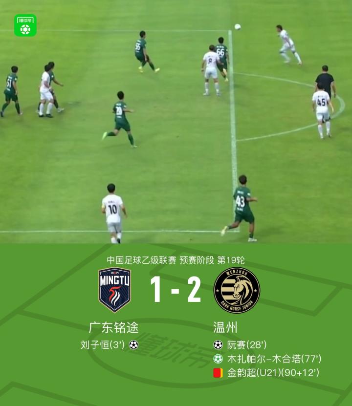 北京时间7月12日中国足球乙级联赛 预赛阶段 第19轮,广东铭途主场对阵温州。广东铭途刘子恒破门。温州阮赛破门,木扎帕尔-木合塔破门。最终比分广东铭途 1-2 温州。