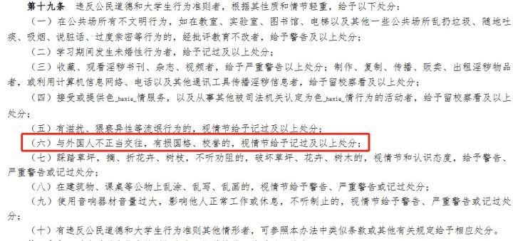根据《大连工业大学学生违纪处分规定》,其中第三章违纪处分分则,第十九条,与外国人不正当交往,有损国格、校誉的,视情节给予记过及以上处分。