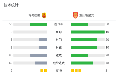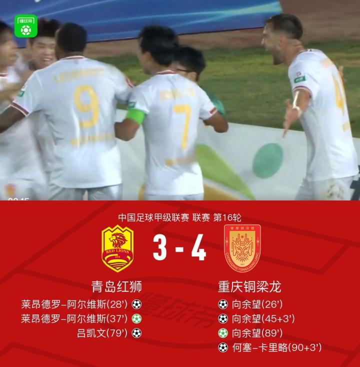 青岛红狮3-4重庆铜梁龙,向余望帽子戏法,卡里略头球绝杀