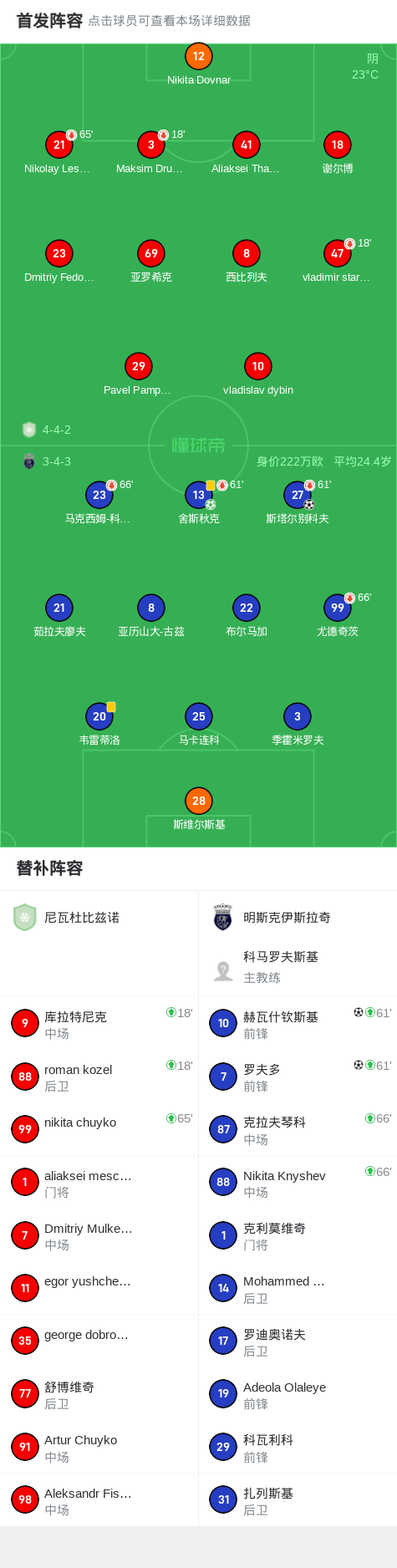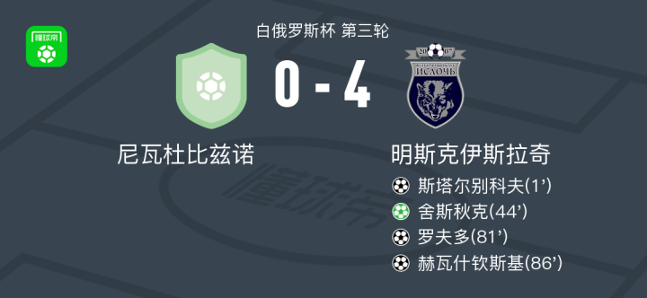 明斯克伊斯拉奇4-0大胜尼瓦杜比兹诺,舍斯秋克点射、赫瓦什钦斯基破门