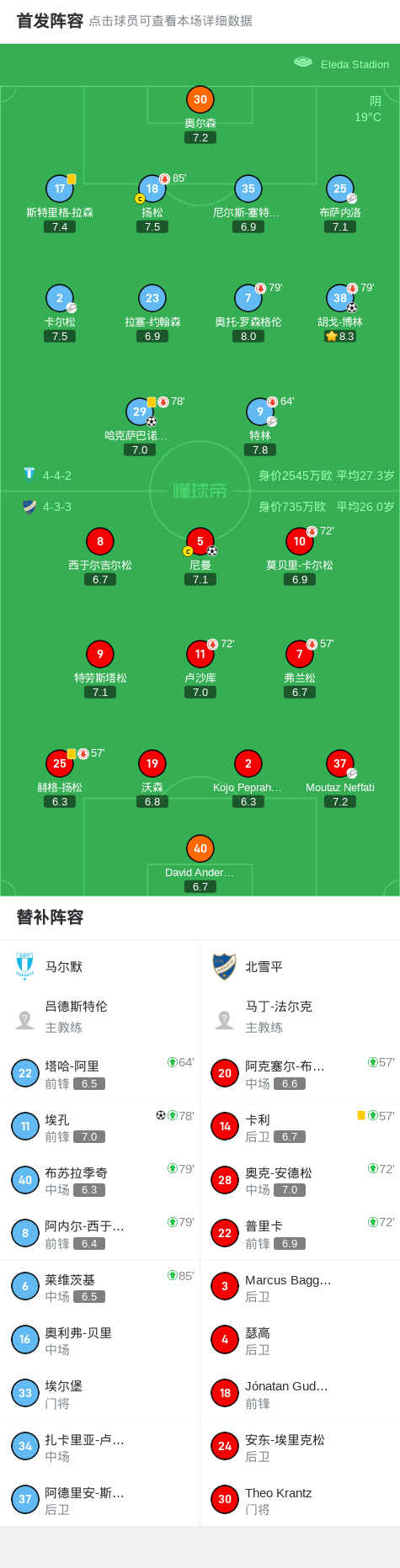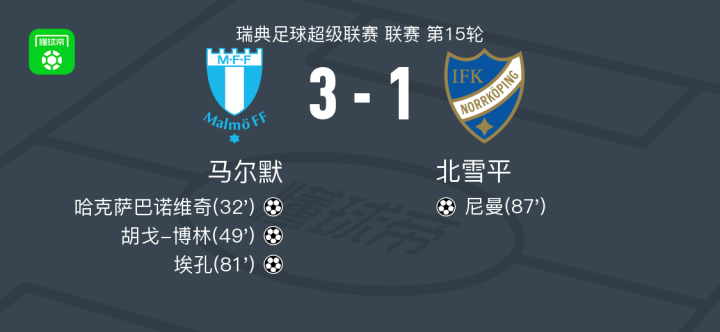 马尔默3-1北雪平,埃孔、胡戈-博林建功