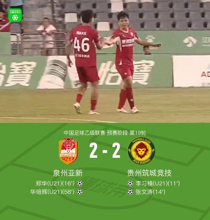 北京时间7月13日中国足球乙级联赛预赛阶段第19轮,泉州亚新主场迎战贵州筑城竞技。比赛第11分钟,贵州筑城竞技由吴俊杰送出助攻,李习楠成功破门。第14分钟,陈晨蓁杨为张文涛创造机会,后者破门扩大比分。泉州亚新在第16分钟由粟嘉乐助攻郑华扳回一城,最终比赛第58分钟,华培辉破门帮助泉州亚新将比分追平。全场比赛结束,泉州亚新2-2战平贵州筑城竞技。