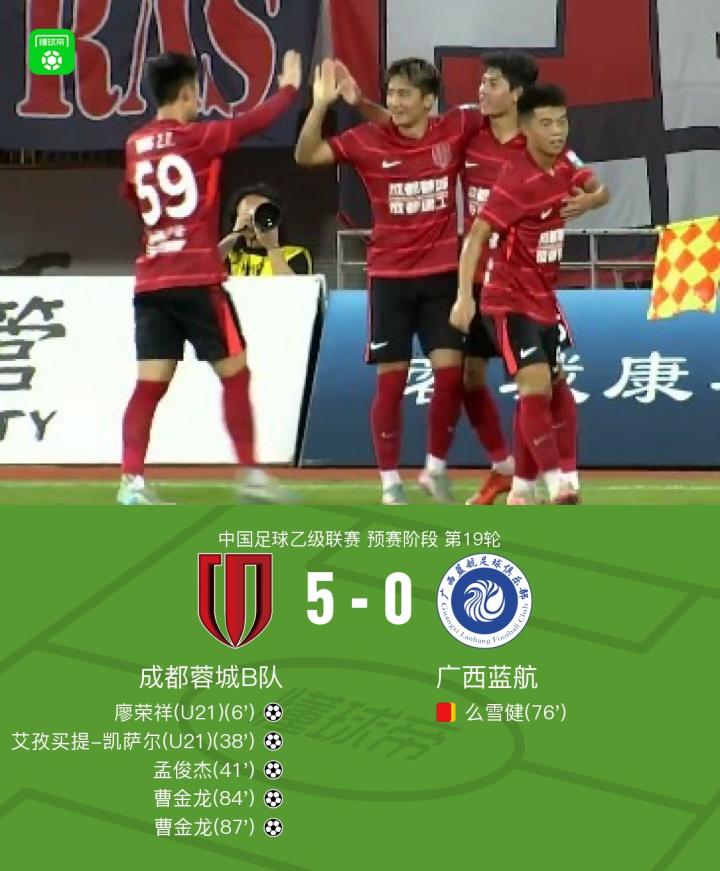 成都蓉城B队5-0大胜十人广西蓝航,曹金龙双响,廖荣祥传射