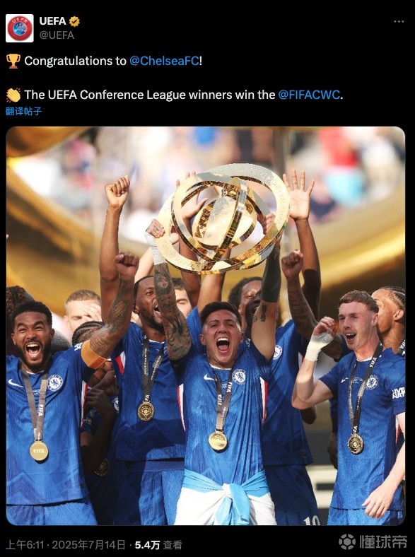 在切尔西夺得2025年世俱杯冠军后,欧足联官方社媒送上祝贺,这是欧足联官媒本届世俱杯期间首次发布有关世俱杯的内容。