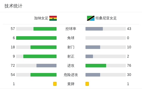 北京时间7月15日,女子非洲国家杯小组赛第三轮,加纳女足与坦桑尼亚女足展开较量。 比赛开始后,加纳女足以积极的姿态展开进攻。第12分钟,普琳塞拉-阿杜贝亚成功破门,为球队首开纪录。随后在第41分钟,坦桑尼亚女足由stumai athumani扳平比分,接到Lunyamila Enekia的助攻完成得分。 进入下半场,加纳女足展现出更强的掌控力。第63分钟,艾丽斯-库西冷静罚入点球,帮助球队再度领先。第87分钟,博伊-赫洛卡送出助攻,巴杜攻入一球扩大比分。比赛临近结束时,第90分钟,恩亚梅凯助攻博伊-赫洛卡再下一城,将比分最终定格在4比1。 全场比赛结束,加纳女足以4比1战胜坦桑尼亚女足。
