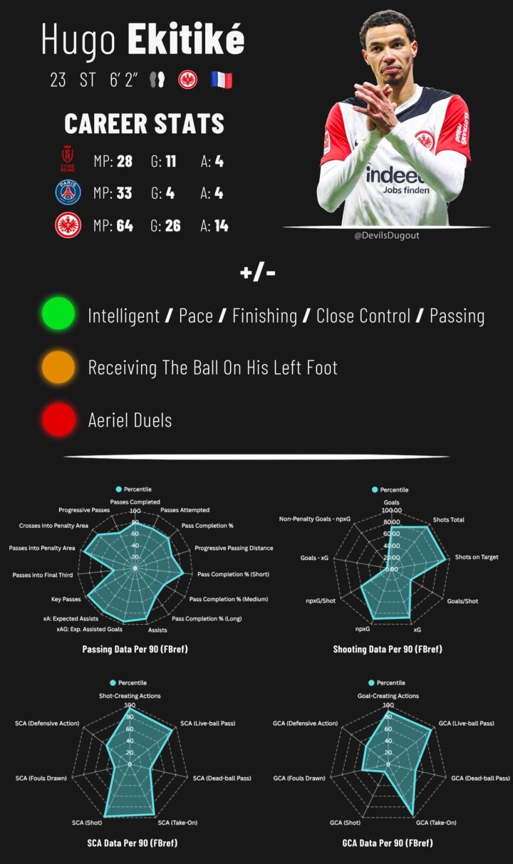 埃基蒂克本赛季上半程在右前锋位置上的表现是无与伦比的,法兰克福的反击战中他在回撤支点和转身上的作用相当明显。