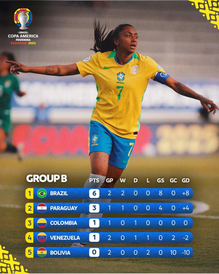 北京时间7月17日早5点,2025年厄瓜多尔女足美洲杯小组赛B组第2轮,巴西队6-0大胜玻利维亚队,赢得两连胜。