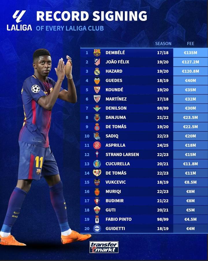 德转列西甲各队历史标王:登贝莱、菲利克斯、阿扎尔包揽前三