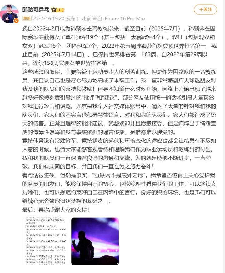7月16日,孙颖莎主管教练邱贻可更新个人社媒表示:大量粉丝对我进行攻击和谩骂。
