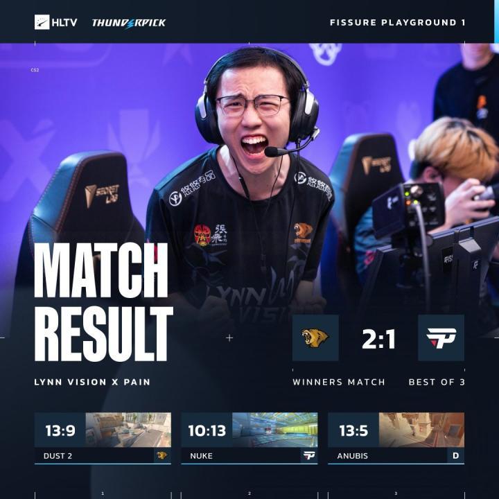 北京时间7月16日,CS2赛事FISSURE Playground1“裂变天地S1”,中国战队LVG苦战三图2-1击败paiN,取得两连胜晋级Playoffs。