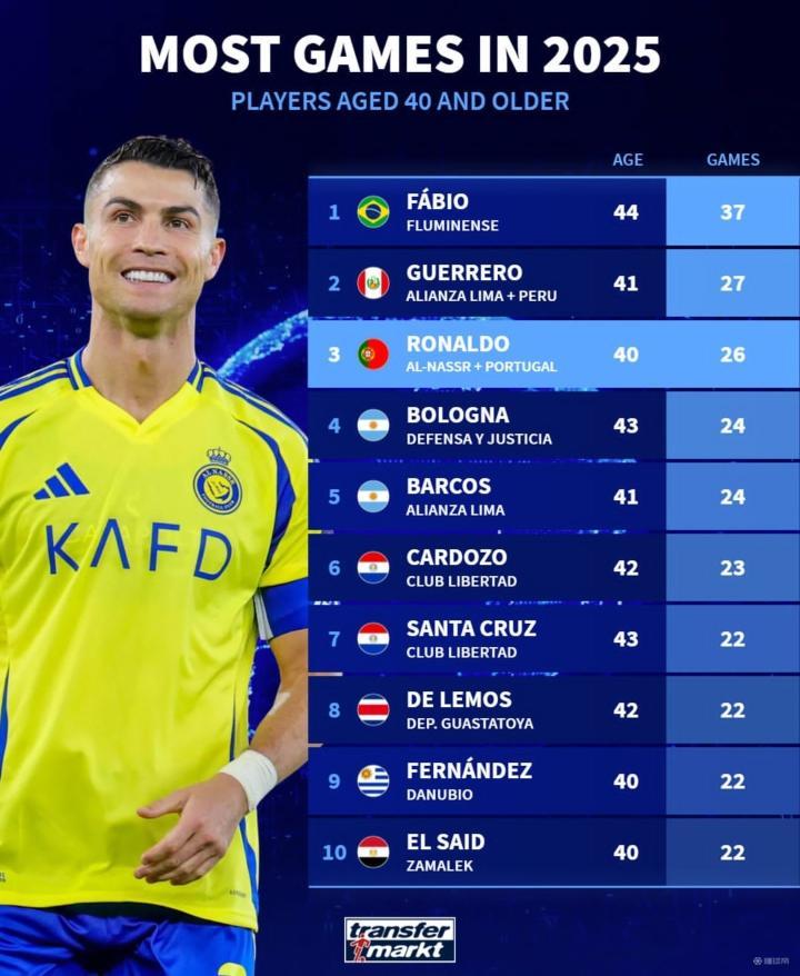弗鲁米嫩塞44岁门将以37场位列榜首,葡萄牙球星C罗以26场比赛位列第3。