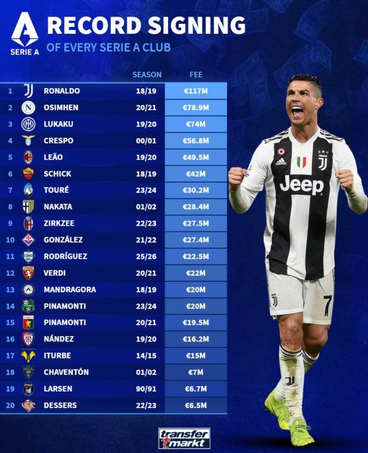 意甲20家俱乐部历史最贵引援:C罗、奥斯梅恩、卢卡库前三