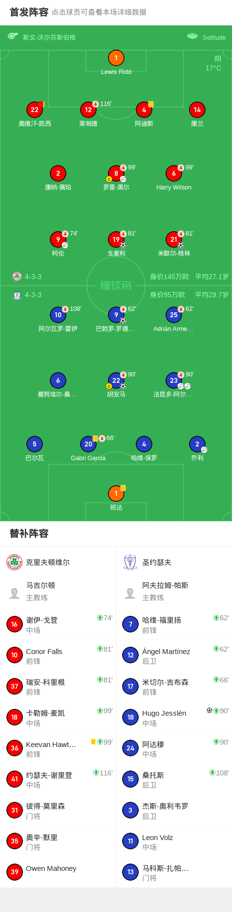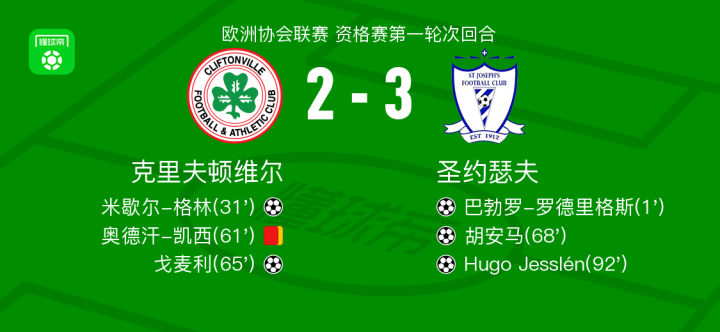 北京时间7月18日欧洲协会联赛 资格赛第一轮次回合,克里夫顿维尔对阵圣约瑟夫。克里夫顿维尔米歇尔-格林破门,戈麦利破门。圣约瑟夫巴勃罗-罗德里格斯破门,胡安马破门,Hugo Jesslén破门。最终比分克里夫顿维尔 2-3 圣约瑟夫。两回合总比分克里夫顿维尔4-5圣约瑟夫。