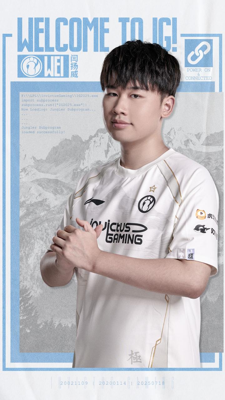 经过与选手的积极沟通以及友好协商后,我们高兴地向大家宣布: 即日起,选手闫扬威(ID:Wei)正式加入iG英雄联盟担任打野位。