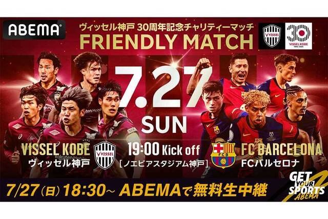 日本ABEMA宣布将免费直播27日举行的J1联赛神户胜利船30周年慈善赛——神户胜利船vs巴塞罗那,比赛预计于当地时间19点(北京时间7月27日20点)开球。
