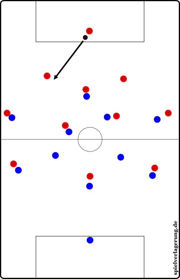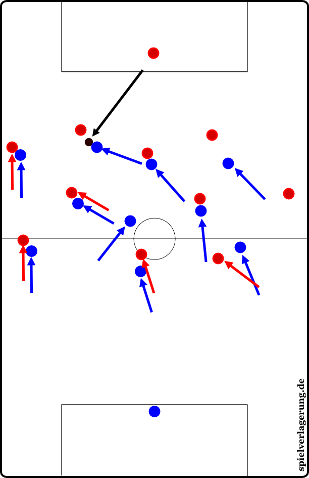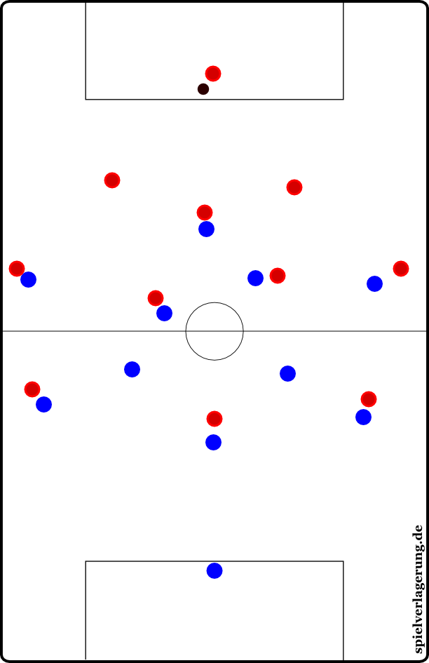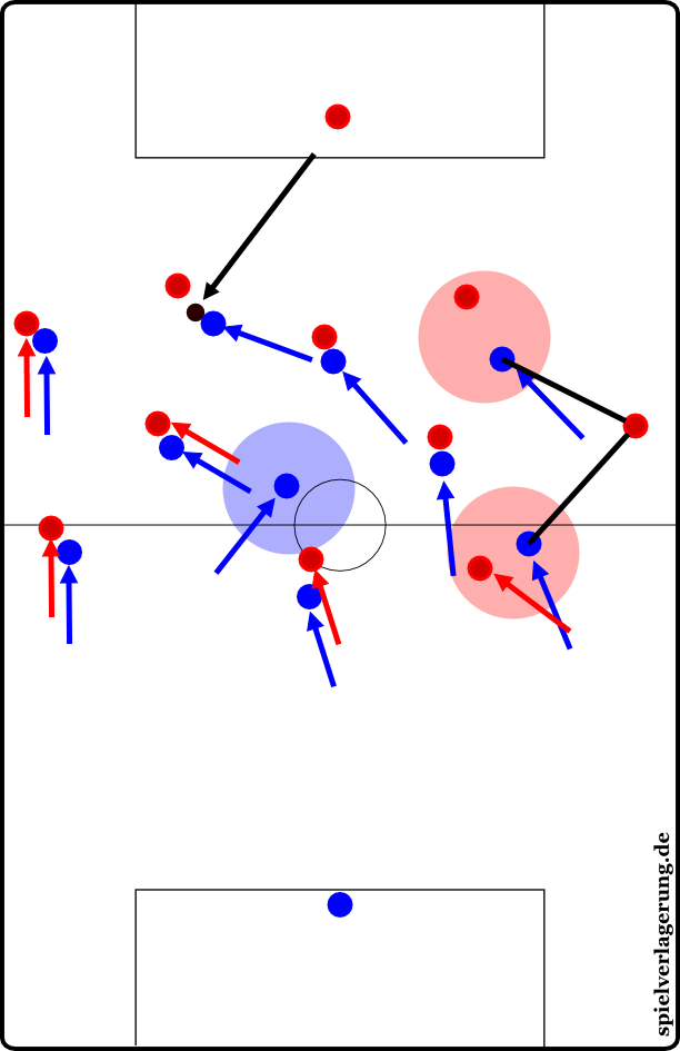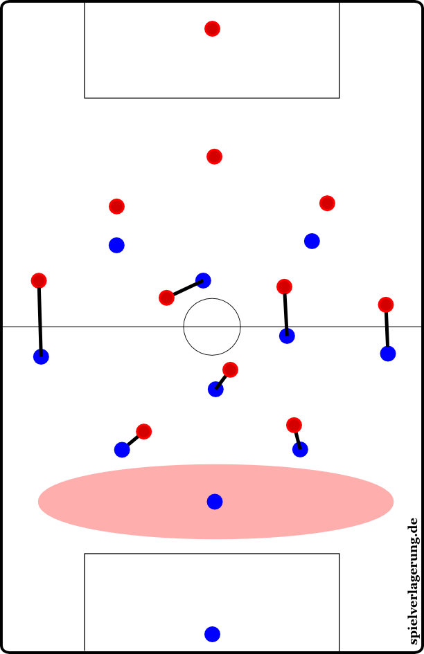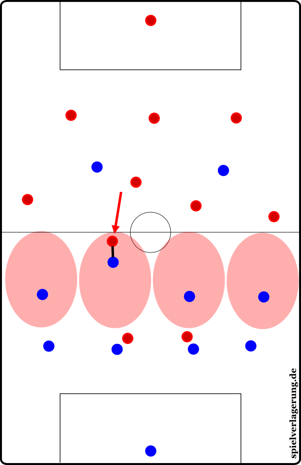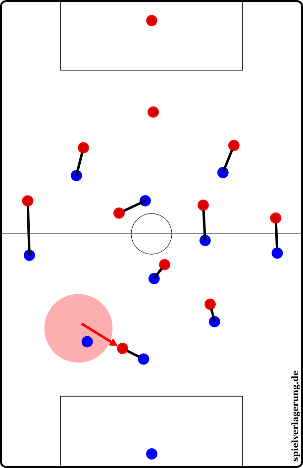 我们要谈的最后一种盯人防守,空间或者说区域导向的盯人防守,在如今德甲还偶尔被使用,例如迪特尔-黑金在他的前俱乐部纽伦堡就使用过。