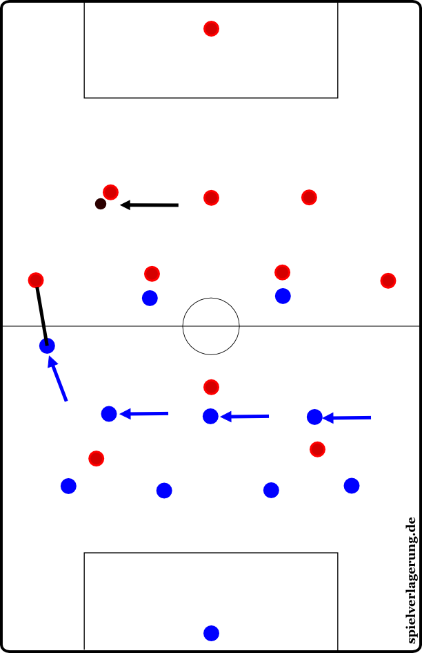 球队的阵型从一开始4-4-2开始向左不对称倾斜,左边锋上前对对方的边后卫开始人盯人防守,其他队友也随之跟进,空间随之压缩。这便是一个应场上变化而对特定位置进行人盯人防守的例子,对这一战术的标准应用通常是在边路,本方边锋盯防对方边后卫,本方边后卫盯防对方边锋。对方的边路球员只有通过回撤才能舒服地拿球,或者即便在前场拿球,也不能轻易转身面对球门。这种情况是希望逼迫对方把球传回中路,或者把球引到本方设下的压迫陷阱里去。