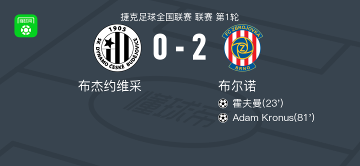 北京时间7月19日,捷克足球全国联赛第1轮,布杰约维采主场迎战布尔诺。比赛中,布尔诺球员霍夫曼在上半场为球队首开纪录,随后Adam Kronus在下半场再下一城。最终,布尔诺以2比0的比分客场取胜。