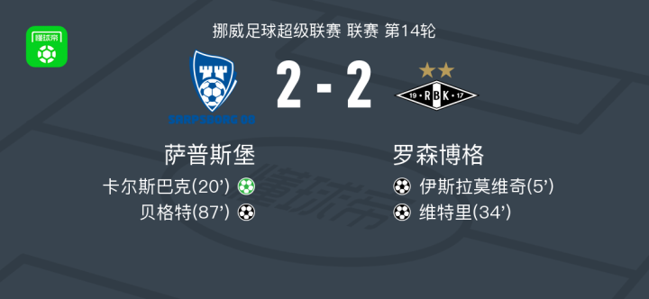 北京时间7月19日,挪威足球超级联赛第14轮,萨普斯堡坐镇主场迎战罗森博格。比赛第5分钟,罗森博格球员塞德送出助攻,伊斯拉莫维奇成功破门,为客队首开纪录。第20分钟,萨普斯堡球员卡尔斯巴克主罚点球命中,将比分扳平。第34分钟,罗森博格球员霍尔姆助攻维特里破门,帮助球队再度取得领先。比赛进入尾声阶段,第87分钟,萨普斯堡球员穆哈纳德-耶阿泽助攻贝格特打入关键进球,最终帮助球队将比分锁定为2比2。全场比赛结束,双方握手言和。
