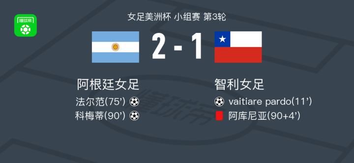 北京时间7月19日女足美洲杯 小组赛 第3轮,阿根廷女足对阵智利女足。阿根廷女足法尔范破门,科梅蒂破门。智利女足vaitiare pardo破门。最终比分阿根廷女足 2-1 智利女足。