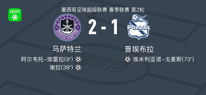 北京时间7月19日,墨西哥足球超级联赛春季联赛第2轮,马萨特兰坐镇主场迎战普埃布拉。比赛中,马萨特兰球员阿尔韦托-埃雷拉在一次进攻中成功破门,为球队首开纪录。随后,队友谢拉再下一城,帮助球队扩大领先优势。进入下半场,普埃布拉由埃米利亚诺-戈麦斯扳回一球,但未能扭转局势。最终,马萨特兰以2比1战胜普埃布拉,全取三分。