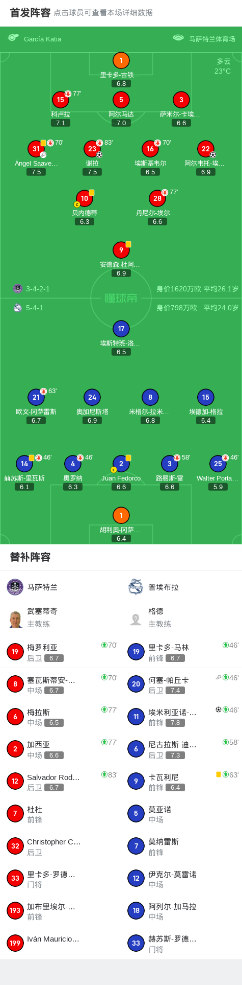 第9分钟,马萨特兰球员Ángel Saavedra助攻阿尔韦托-埃雷拉打入一球。