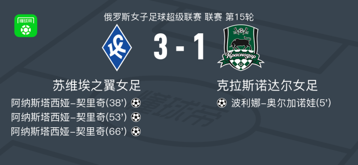 北京时间7月19日俄罗斯女子足球超级联赛第15轮,苏维埃之翼女足主场迎战克拉斯诺达尔女足。比赛中,克拉斯诺达尔女足由波利娜-奥尔加诺娃率先破门。随后,苏维埃之翼女足展开强势反击,蒂亚娜-马蒂奇与奥西波娃分别送出助攻,帮助阿纳斯塔西娅-契里奇梅开二度,此后阿纳斯塔西娅-契里奇再入一球完成帽子戏法。最终比分苏维埃之翼女足 3-1 克拉斯诺达尔女足。