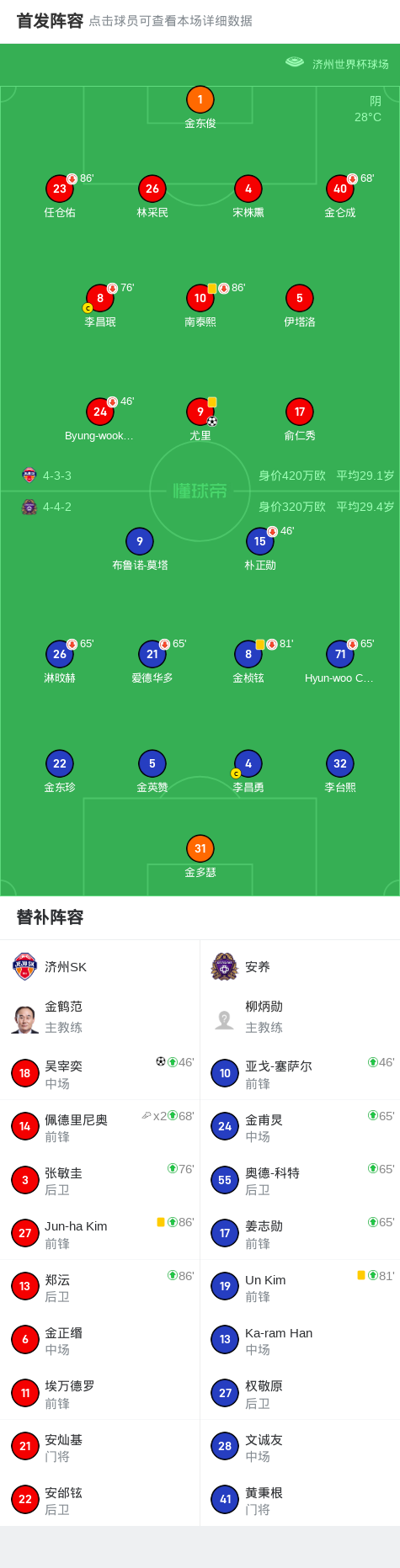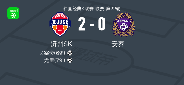 7月19日,韩国经典K联赛第22轮,济州SK坐镇主场迎战安养。比赛中,济州SK由吴宰奕和尤里各入一球,最终以2比0战胜对手,全取三分。