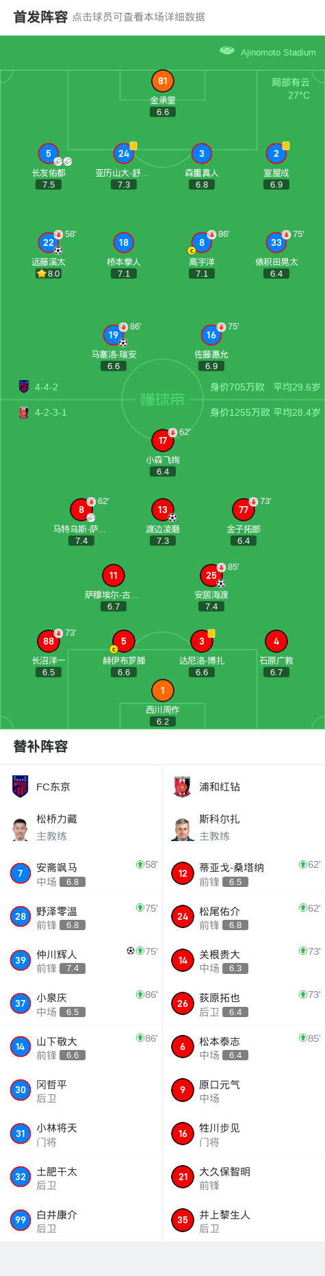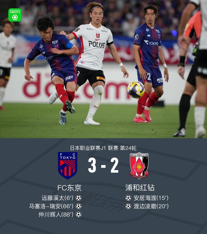 北京时间7月19日日本职业联赛J1 联赛 第24轮,FC东京主场对阵浦和红钻。FC东京远藤溪太、马塞洛-瑞安建功,仲川辉人绝杀。浦和红钻安居海渡、渡边凌磨破门。最终比分FC东京 3-2 浦和红钻。